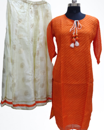 Exotic Gold Print Skirt paired with Lehria-Mothra Orange Coloured Kurti