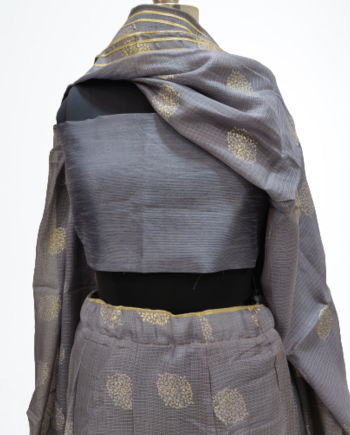 Glowing Grey Coloured Kota Lehenga with Gold Print Dupatta
