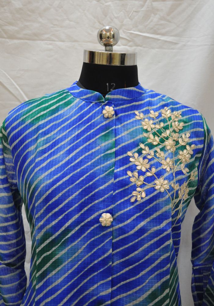 Give your weekend styling a trendy makeover wearing this blue and green colored party wear gotta work Kota kurti. This kurti fabric is lightweight and assures the wearer a perfect fit & comfort. This stitched kurti beautified with latest trend & fashion as shown.