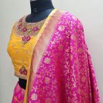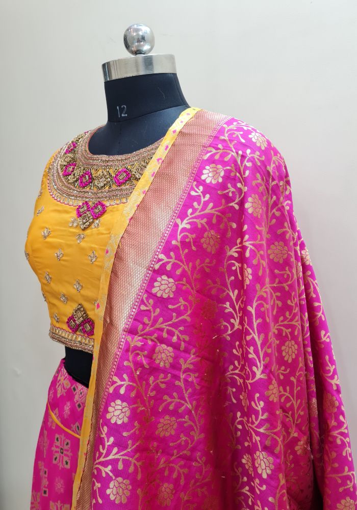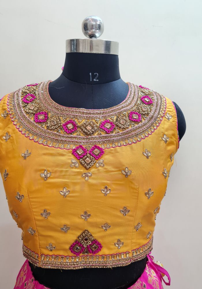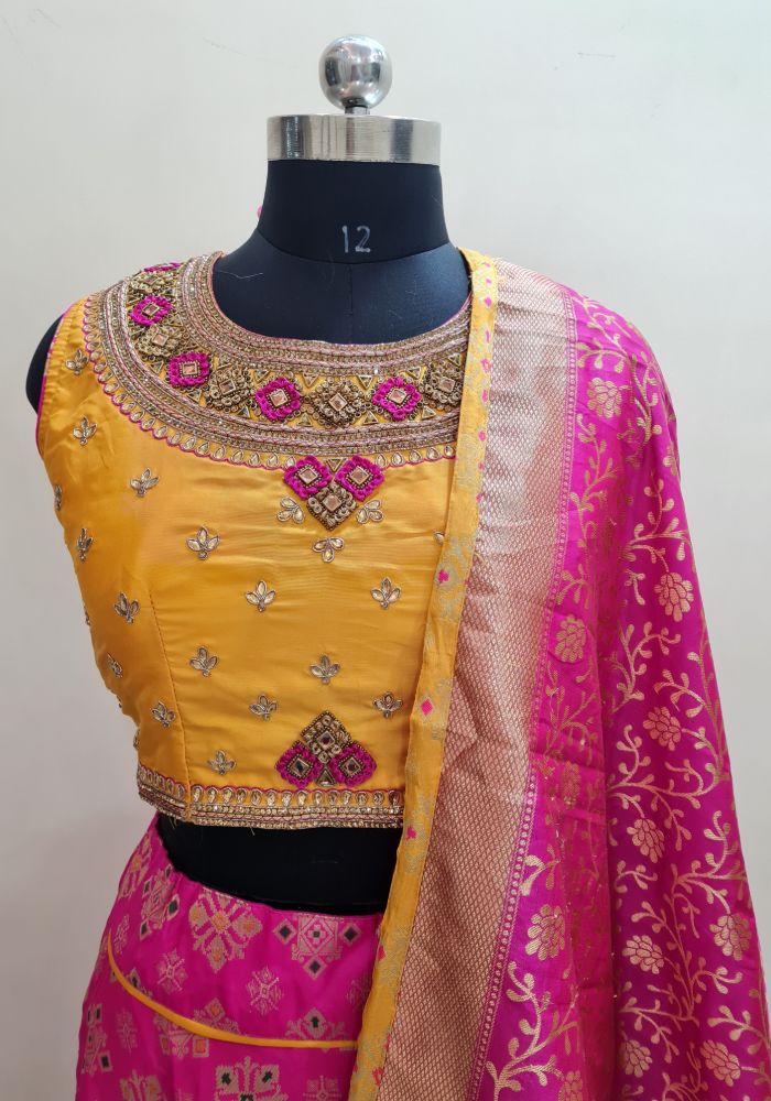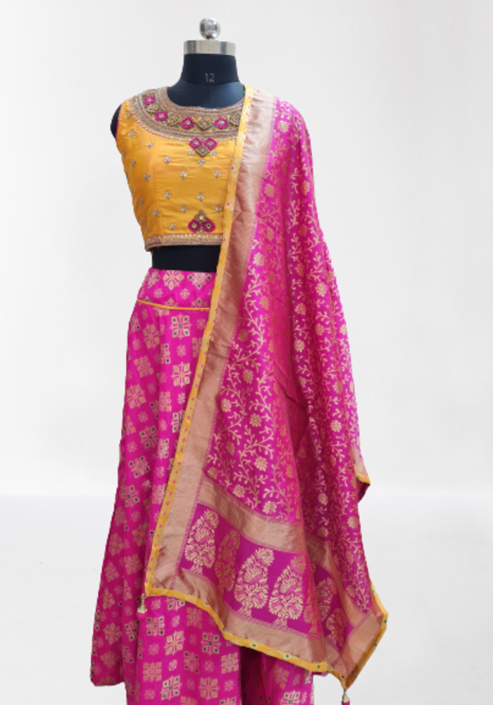 Bring out the true diva in you and reinvent your true self. We unfurl our intricacy and exclusivity of our creations highlighted in this lovely yellow-pink coloured Stitched lehenga choli. The ethnic embroidered lace resham and zari work within the apparel adds a sign of beauty statement with a look.