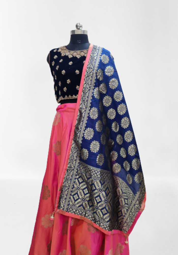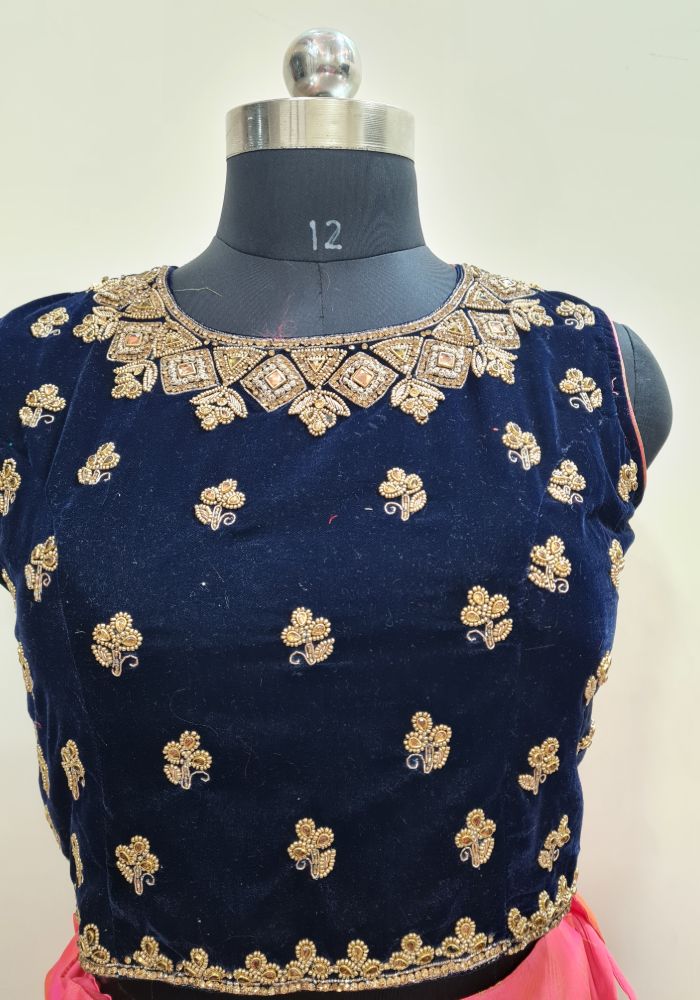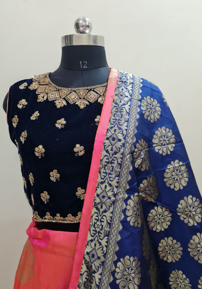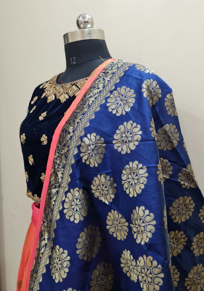 Bring out the true diva in you and reinvent your true self. We unfurl our intricacy and exclusivity of our creations highlighted in this lovely navy blue-Peach coloured Stitched lehenga choli. The ethnic embroidered lace resham and zari work within the apparel adds a sign of beauty statement with a look.