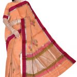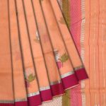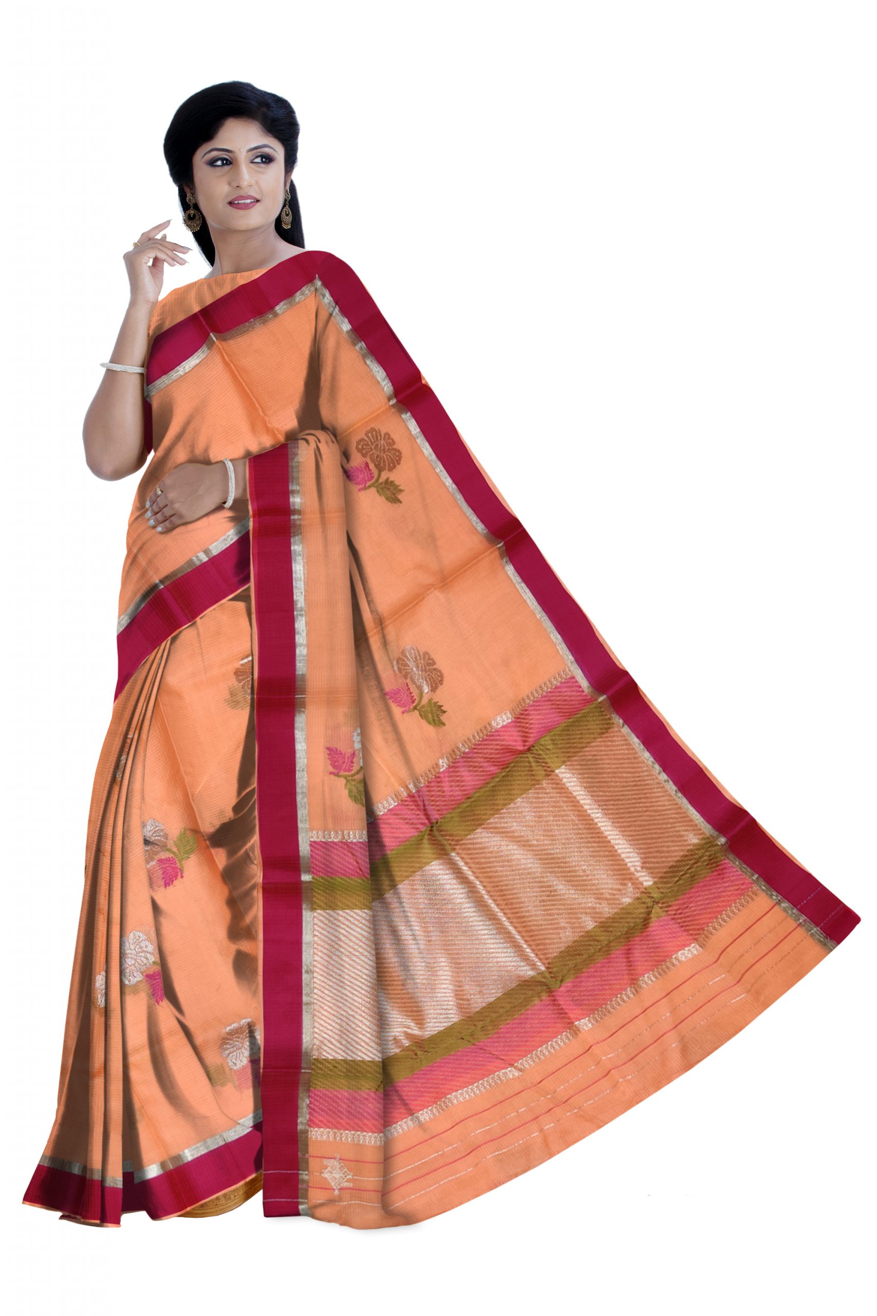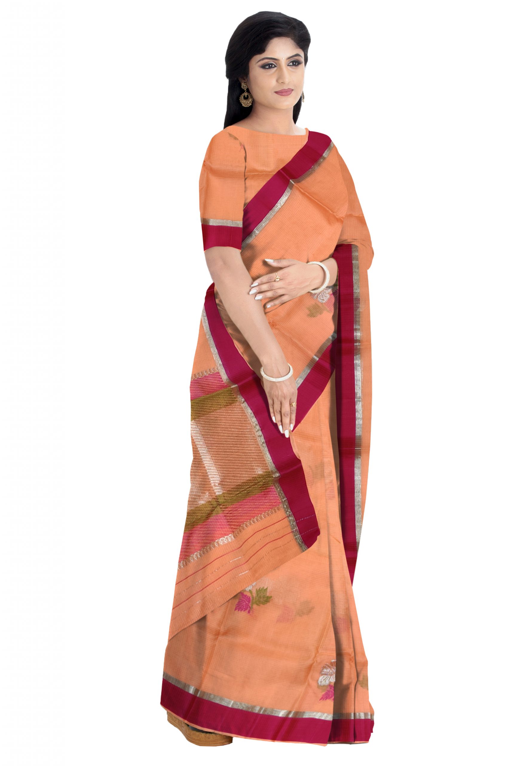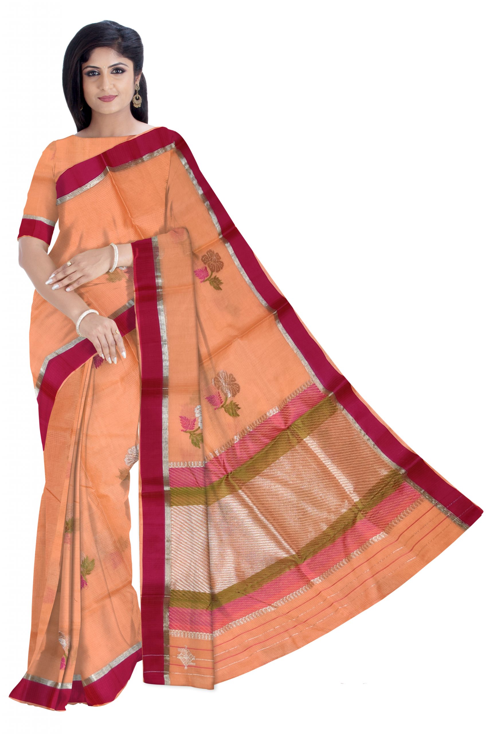 You are bound to make a powerful fashion statement with this peach colored saree. This saree is made of Pure Kota fabric which is highlighted with beautiful real silver and gold woven designs which makes this saree more elegant.