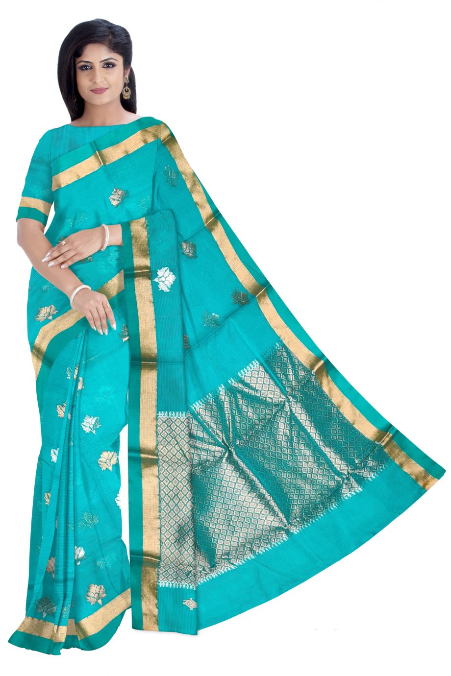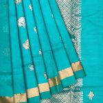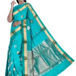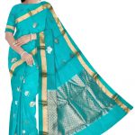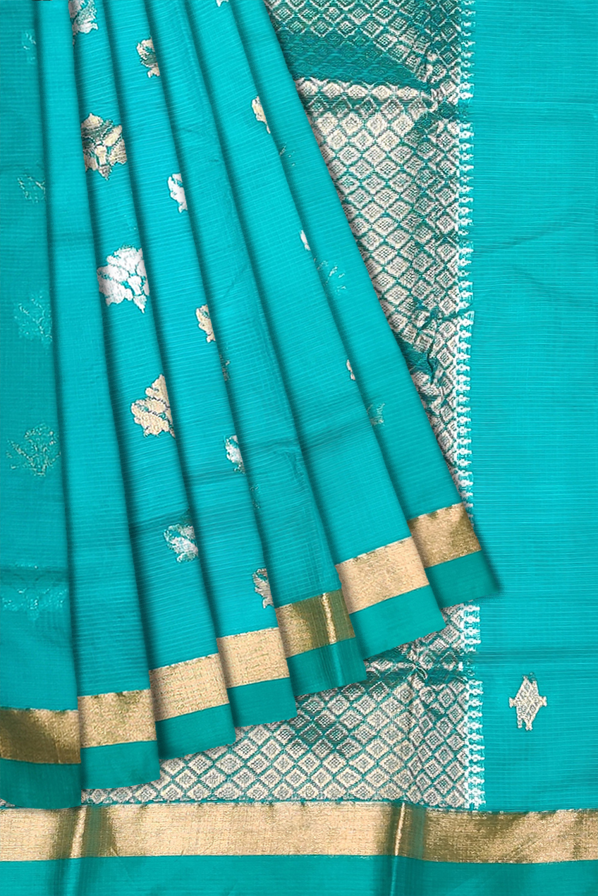 You are bound to make a powerful fashion statement with this sea blue colored saree. This saree is made of Pure Kota fabric which is highlighted with beautiful real silver and gold woven designs which makes this saree more elegant.