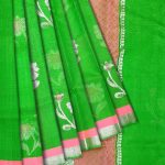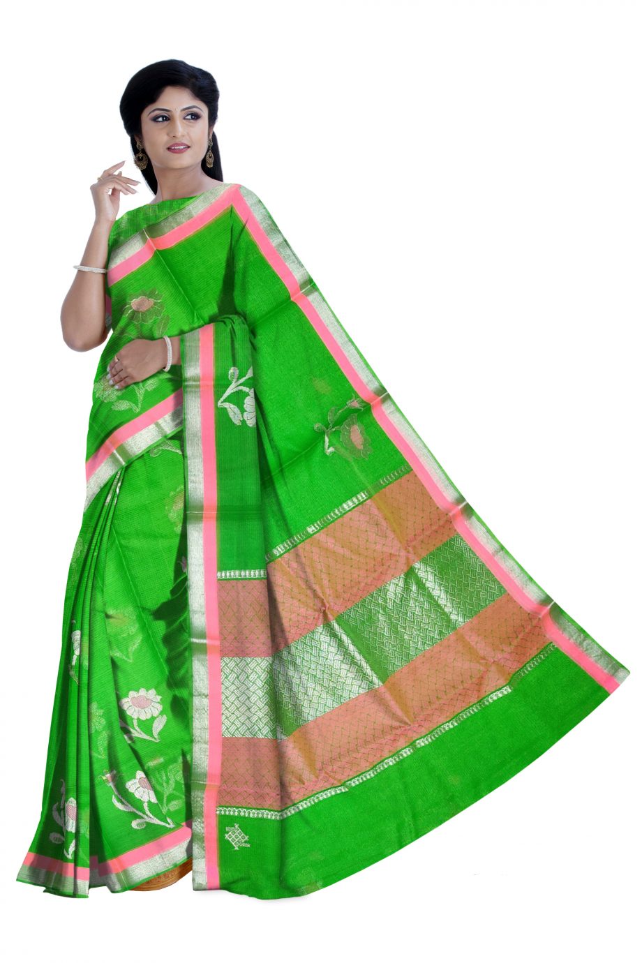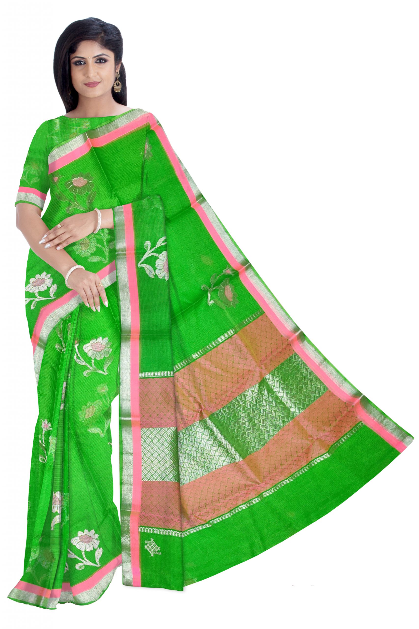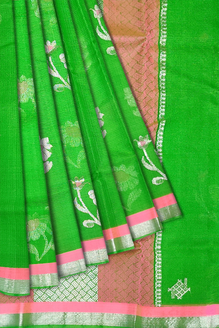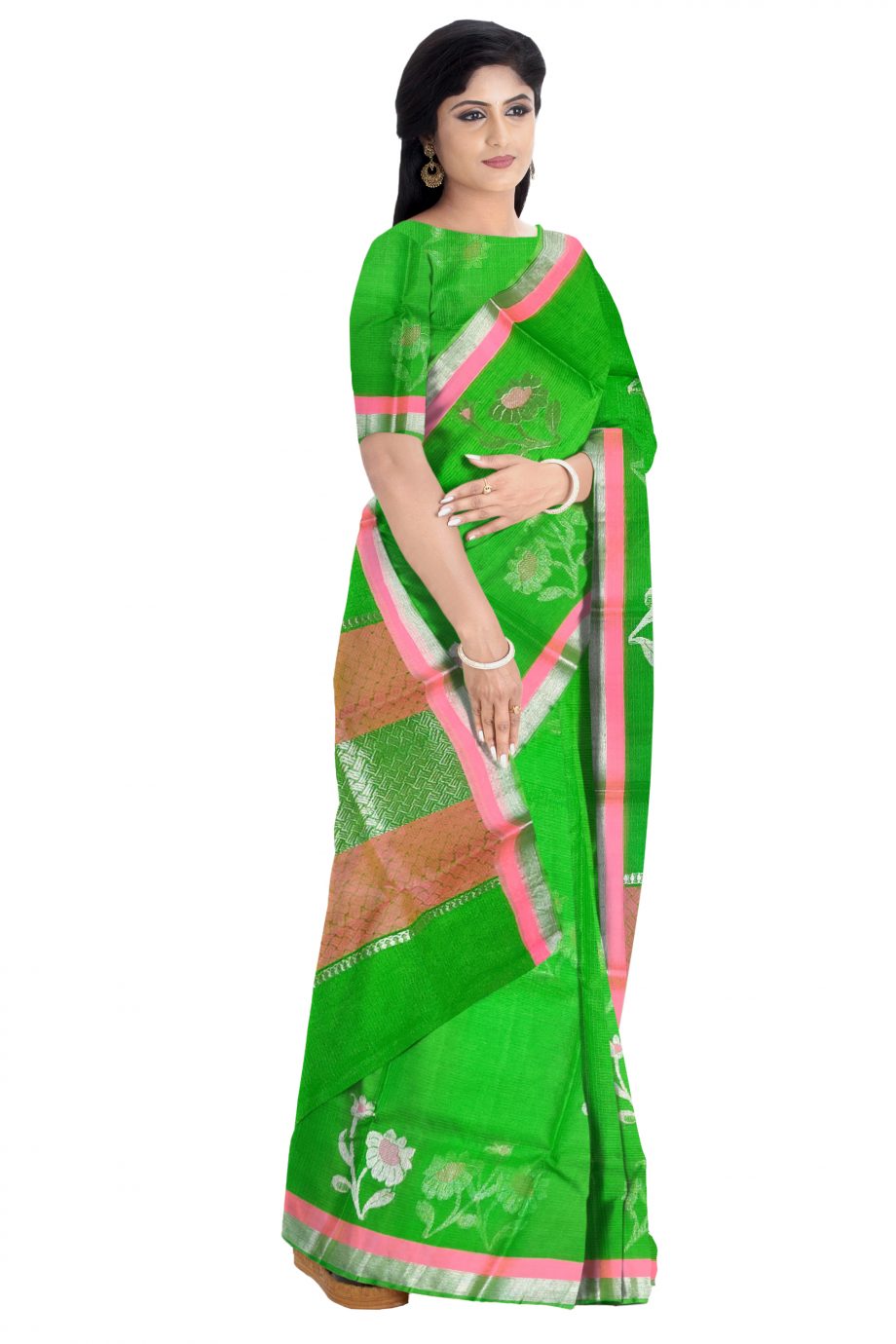 Elegance and honourable come together in this olive green colored saree. This saree is made of Pure Kota fabric which is highlighted with beautiful real silver and gold woven designs which makes this saree more elegant.