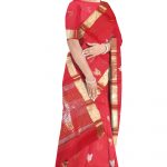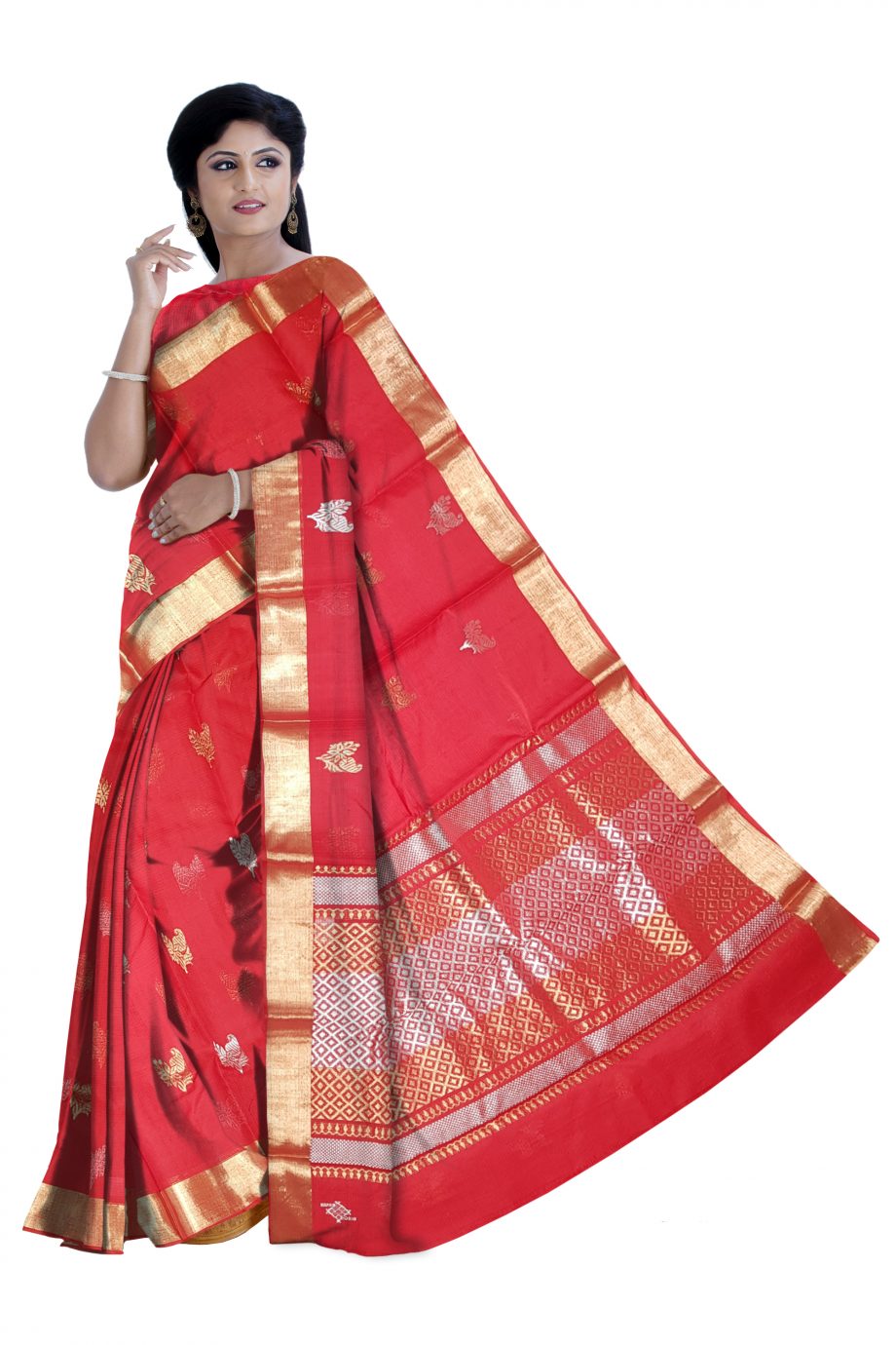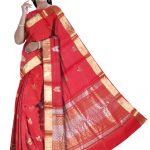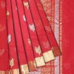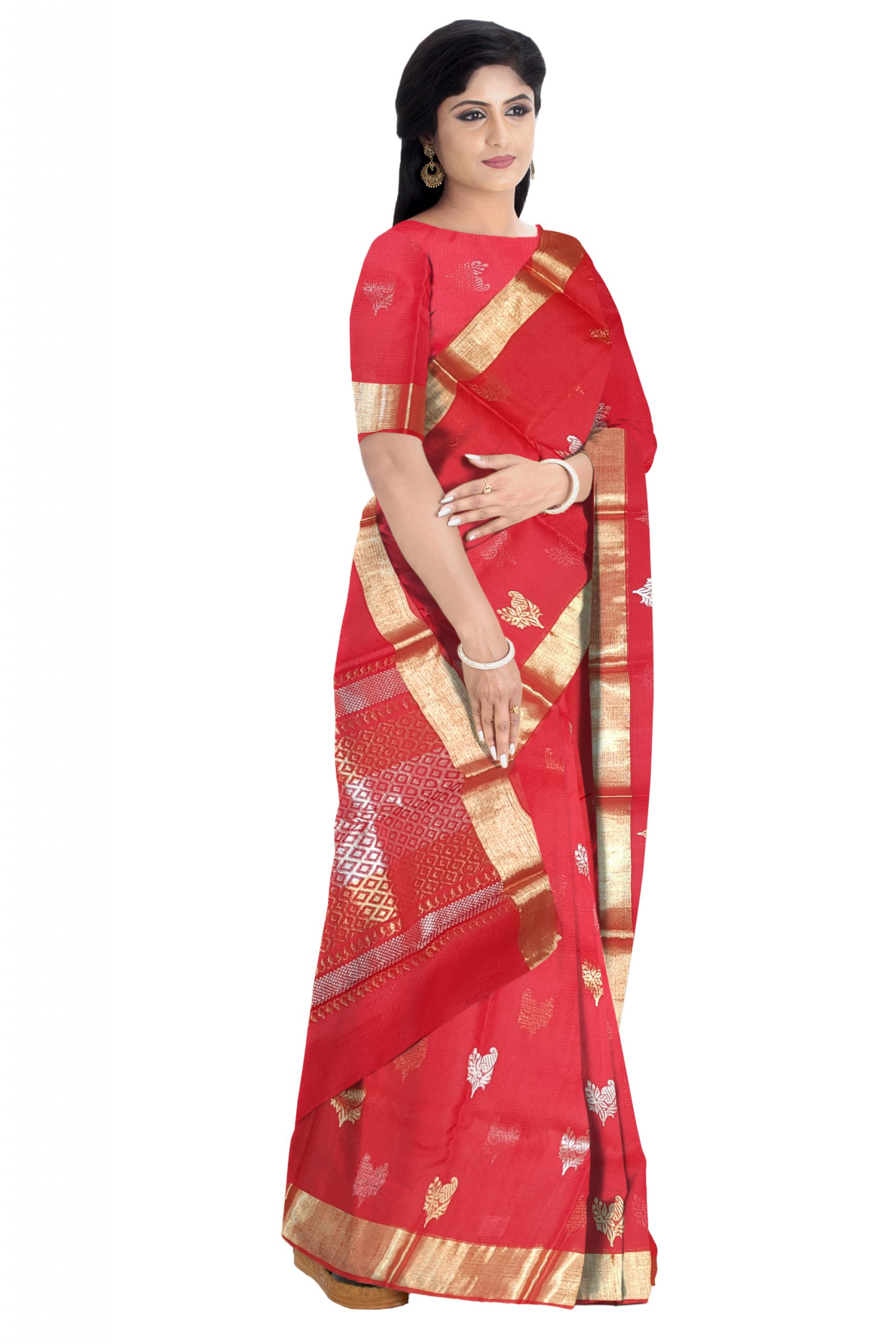 You are bound to make a powerful fashion statement with this red colored saree. This saree is made of Pure Kota fabric which is highlighted with beautiful real silver and gold woven designs which makes this saree more elegant.