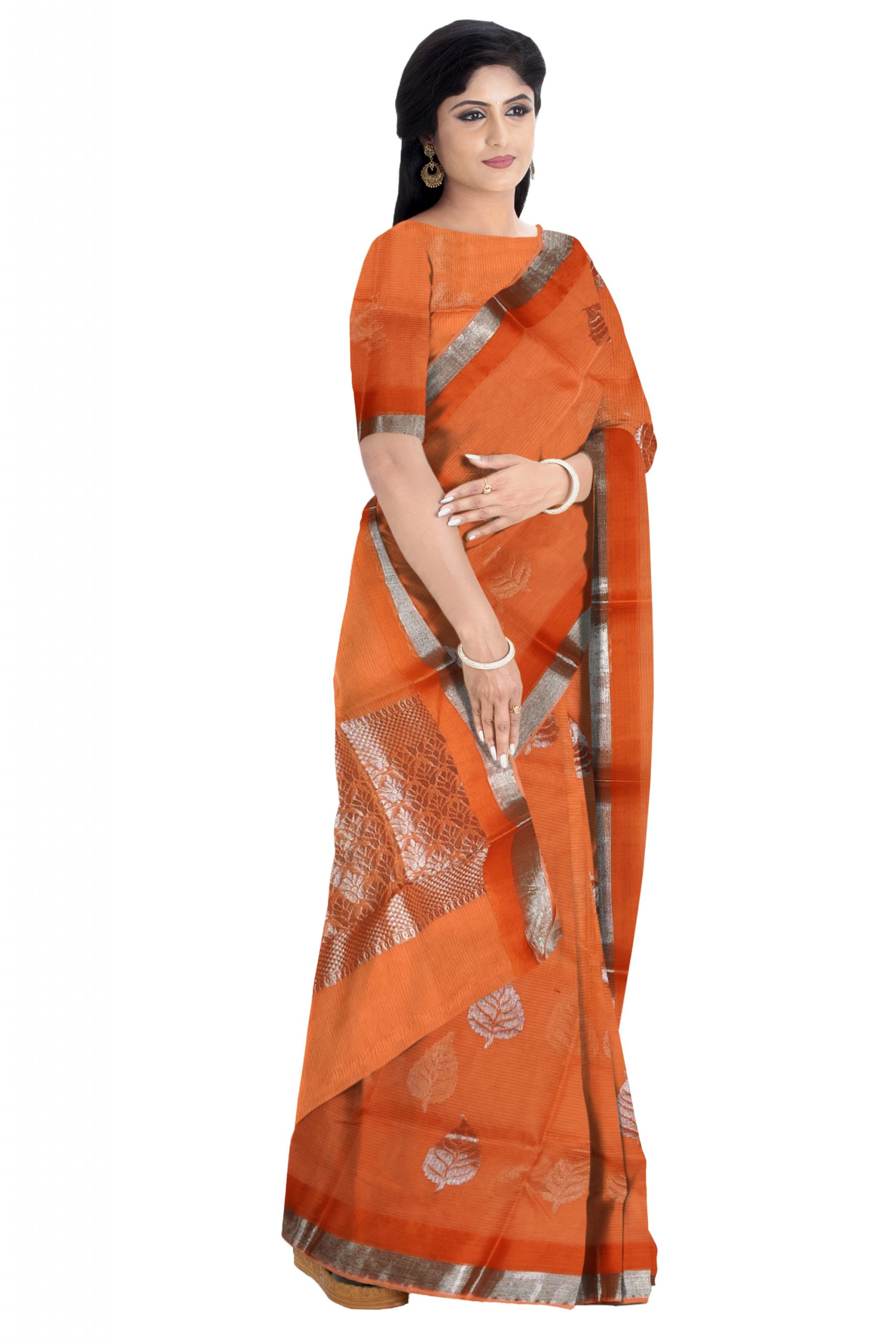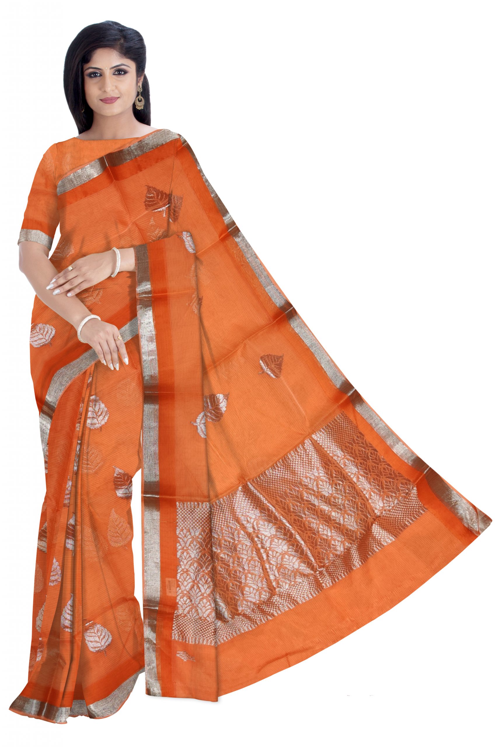 Elegance and honourable come together in this orange colored saree. This saree is made of Pure Kota fabric which is highlighted with beautiful real silver and gold woven designs which makes this saree more elegant.