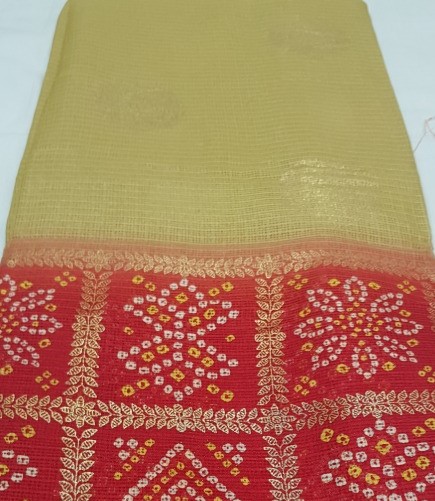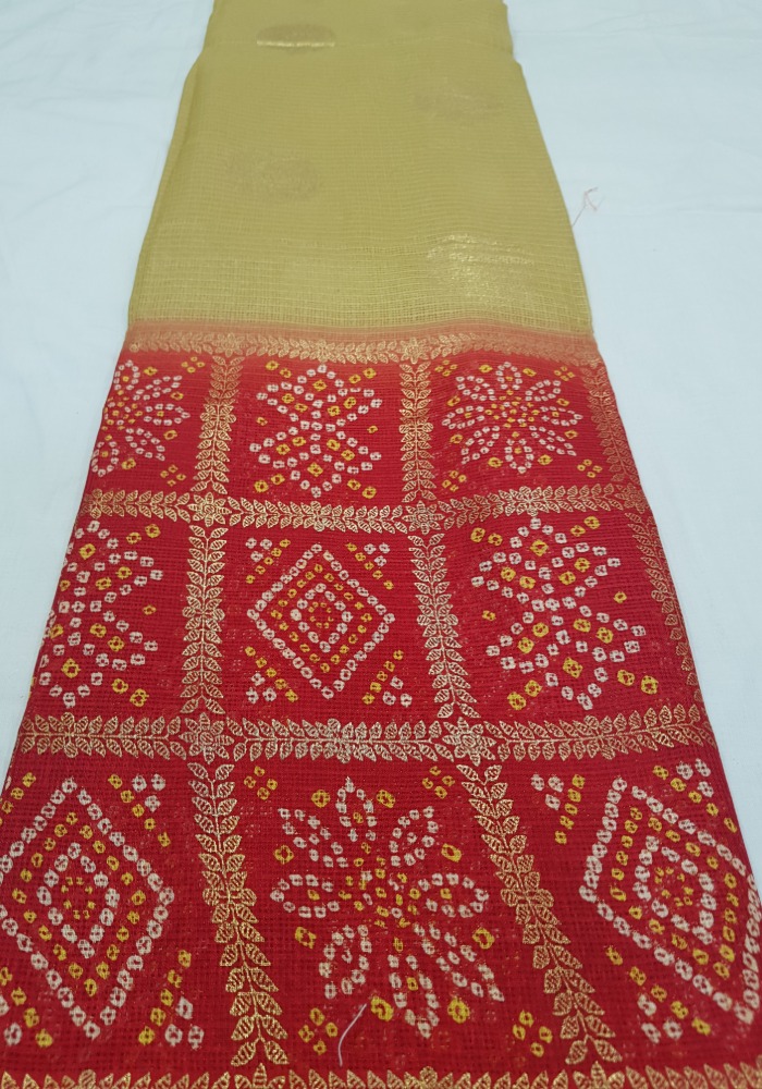 Include yourself in the glamour of the season with this arresting red-beige colored saree. The saree is made of Silk Kota fabric and has a beautiful gold print work along with tassels border which attracts the crowd.