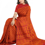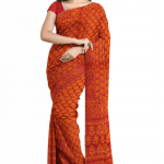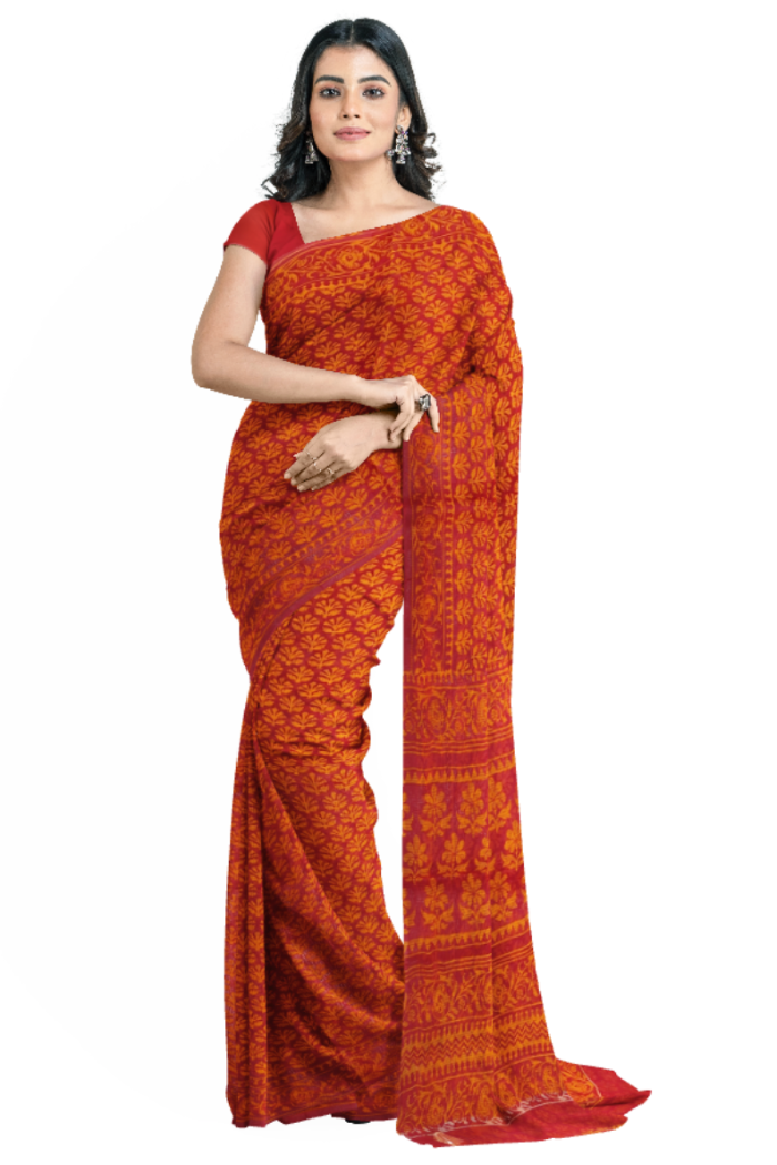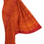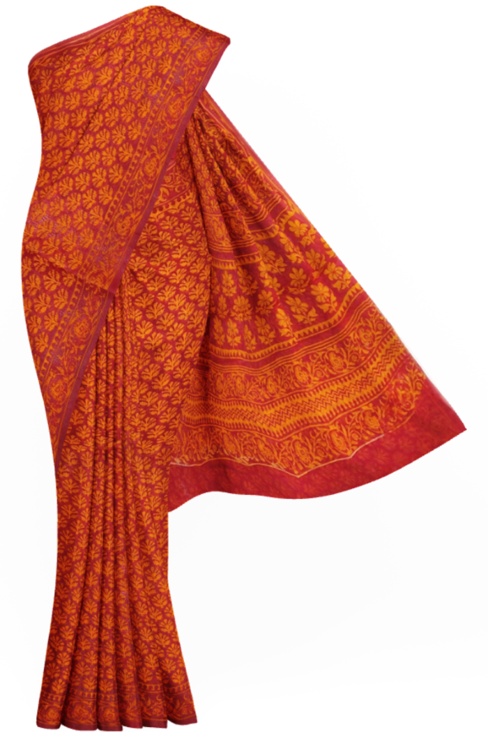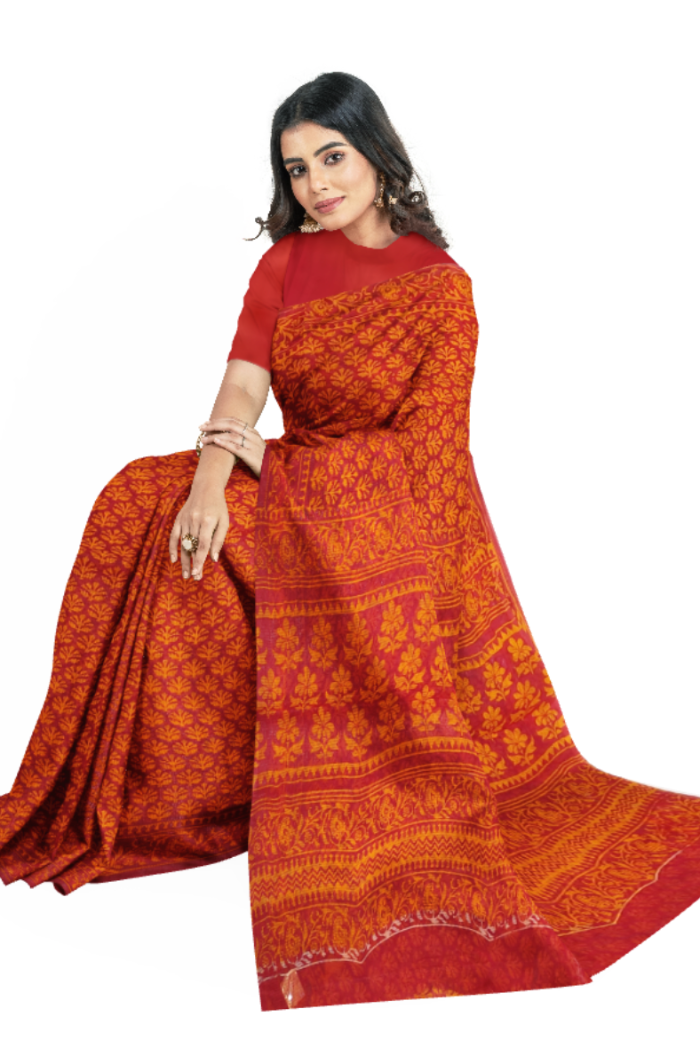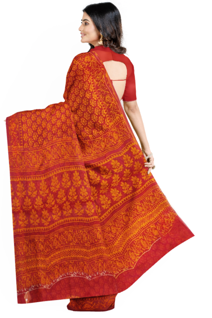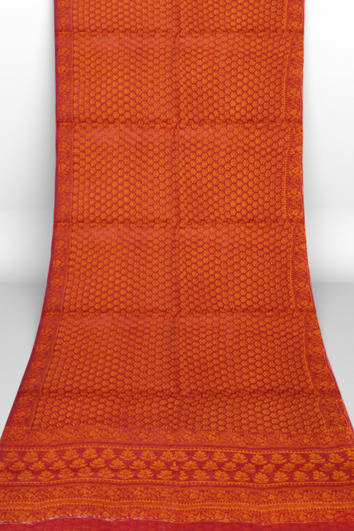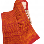 We unfurl our intricacy and exclusivity of our creations highlighted in this Red Yellow coloured saree. This saree is made from kota doria fabric which is highlighted with beautiful flower printed work as shown. The chequered weave of a Kota sari is it’s speciality. They are very fine weaves and weigh very less. This saree is comfortable to wear and care.