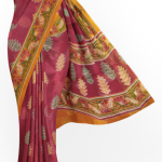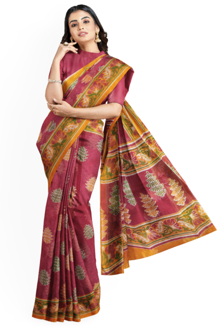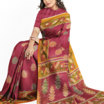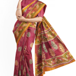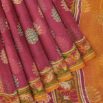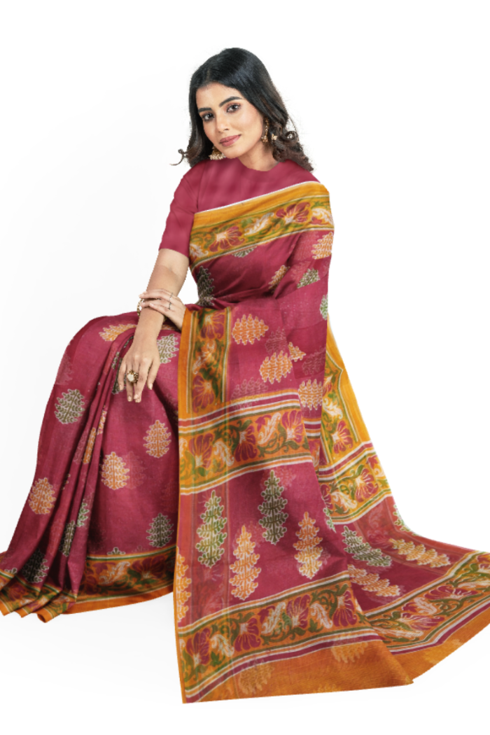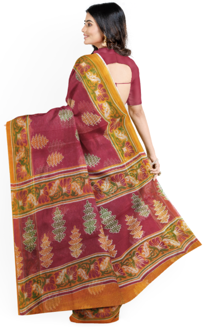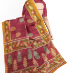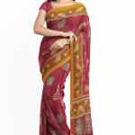 We unfurl our intricacy and exclusivity of our creations highlighted in this Maroon coloured saree. This saree is made from kota doria fabric which is highlighted with beautiful flower printed work as shown. The chequered weave of a Kota sari is it’s speciality. They are very fine weaves and weigh very less. This saree is comfortable to wear and care.